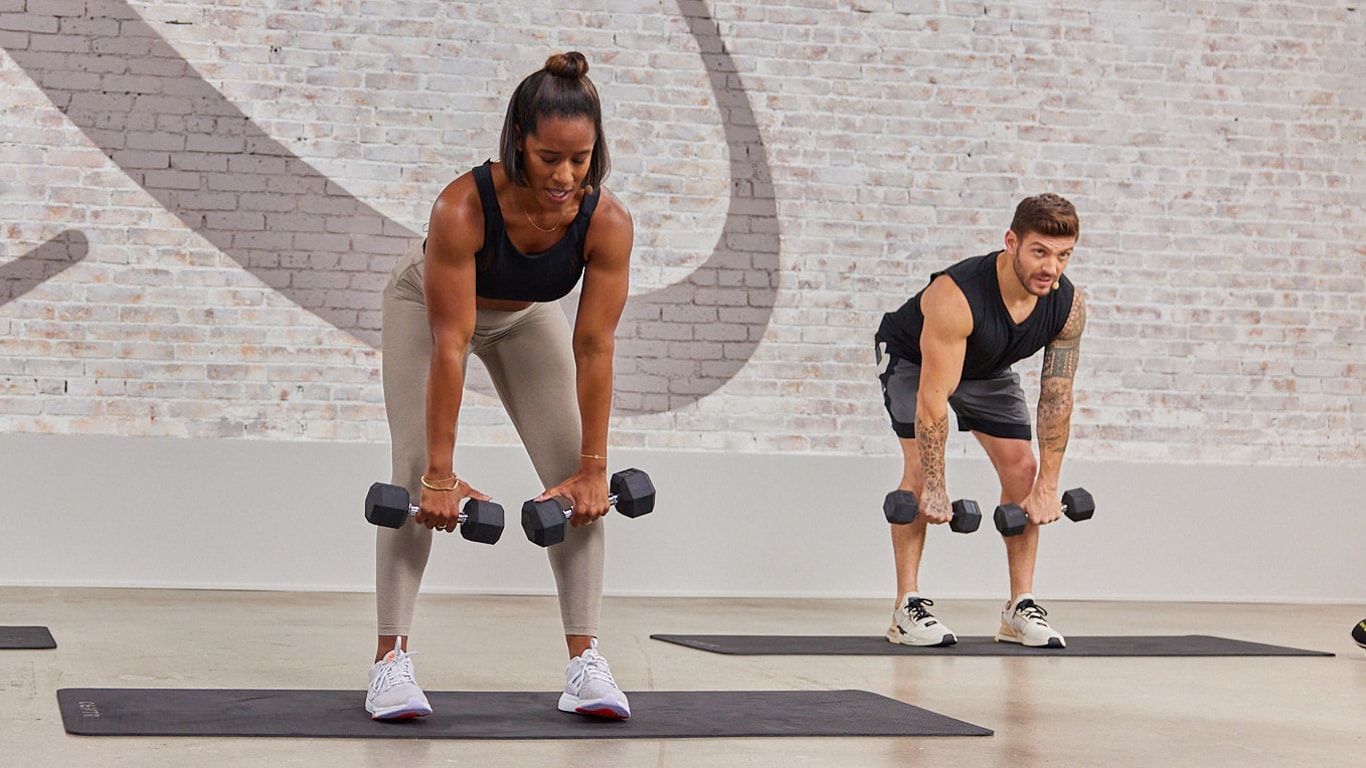 Stand with feet hip-width apart, holding a barbell or dumbbells in front of your thighs.