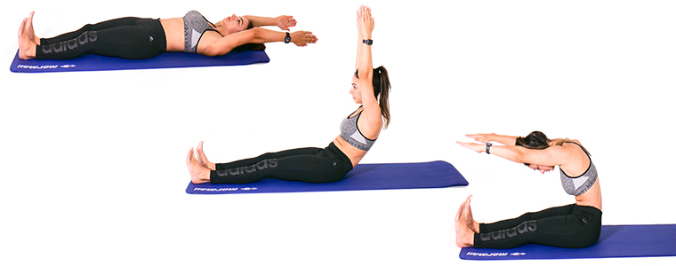 2 - Inhale, lift your arms toward the ceiling, and then exhale as you slowly roll up to a seated position, reaching for your toes.